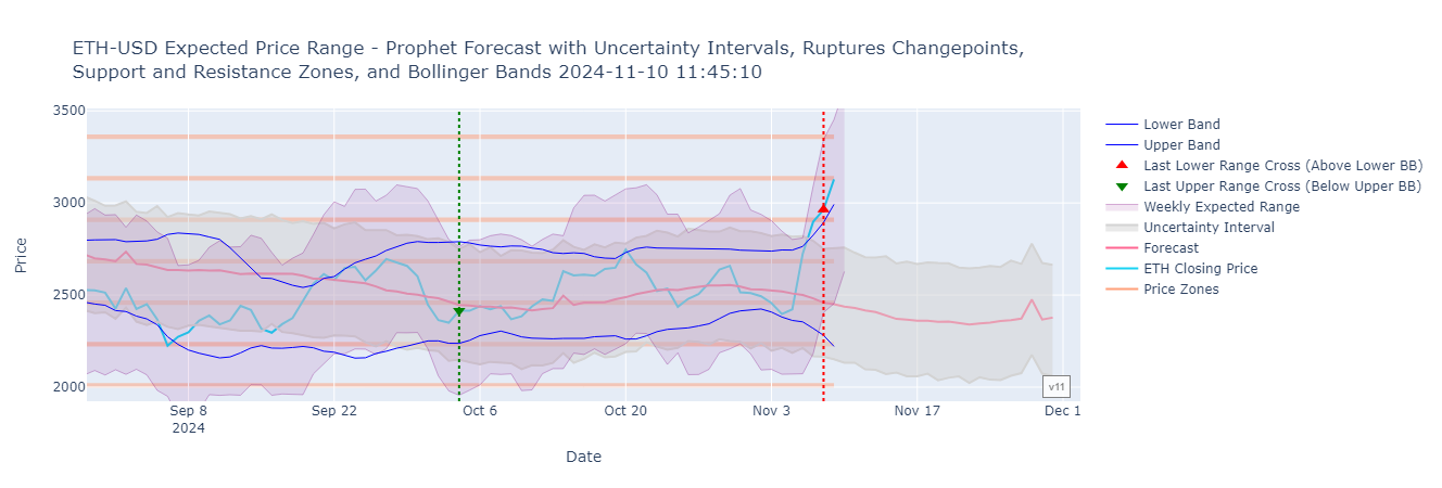 The current technical indicators show a support level at $2,221.36 and a resistance level at $3,622.41. The recent lower band cross on November 8, 2024, indicates potential bearish momentum, aligning with the forecasted price decline. The Bollinger Bands suggest that ETH is currently trading above the upper band ($2,992.28), which typically signals overbought conditions.